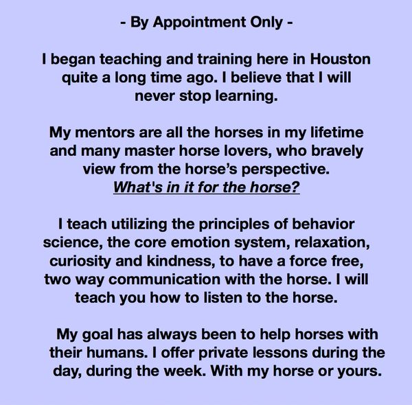 Are you studying, interested in IntrinZen, Panther Flow, Pain Science, One Horse Life Relaxation Techniques, CAT, BAT, R+, Clicker Training? Horseback riding near me, Horseback riding Houston