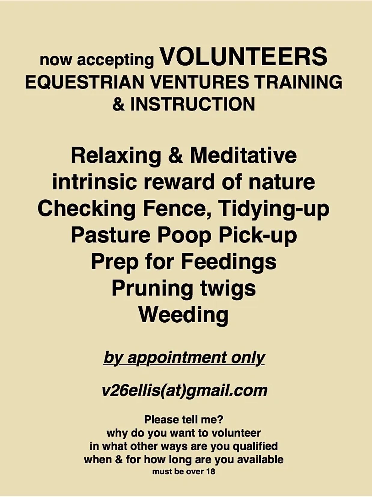 A 'Volunteer' to Equestrian Ventures would be 'of service' to the horses, doing the things described here in this volunteer link,